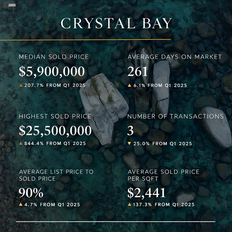 Crystal Bay experienced one of the most dramatic shifts in the region, largely driven by a small number of high-end and lakefront transactions. The median sold price jumped over 200%, climbing to $5.9 million while average sold price per sqft surged more than 137%.