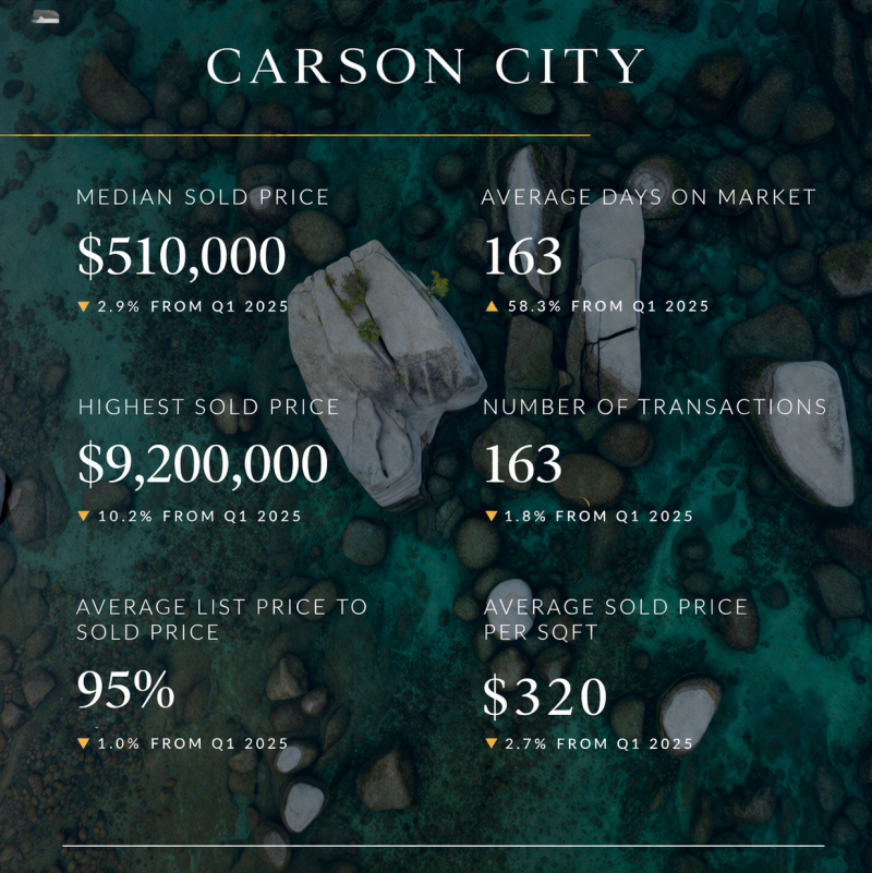 Carson City showed early indicators of a slowing market. Median home prices dipped slightly by 2.9% and transaction volume declined marginally. The most notable shift was the sharp increase in days on market which rose by over 58%. This suggests homes are taking significantly longer to sell giving buyers more leverage and reducing urgency in the market.