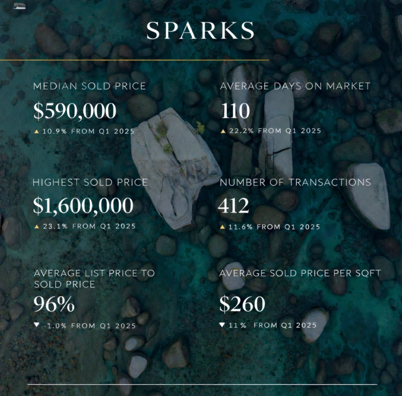 Sparks experienced solid price appreciation, with median home values rising 10.9% and transaction volume increasing by roughly 11.6%. This reflects continued demand in the more affordable segment of the market.